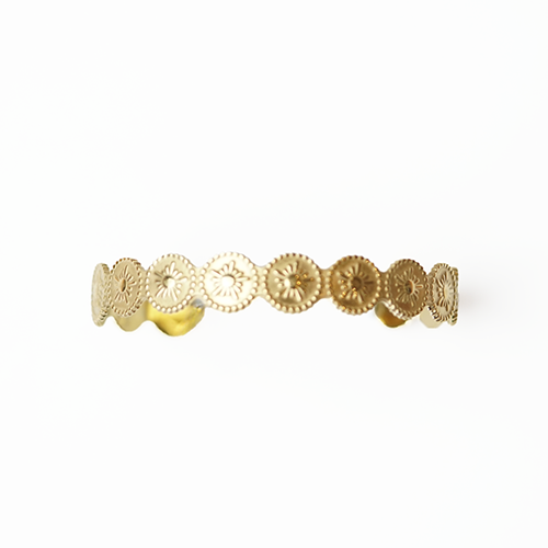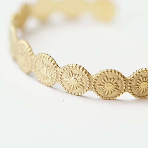 Sun motif bangle in 24K PVD Gold Surgical Steel. Tarnish-resistant and fashion-forward for bold styling.