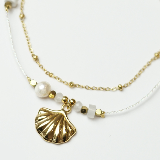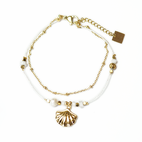 Shell charm threaded into 24K PVD Gold Surgical Steel. Water-resistant and trendy for beach-inspired looks.