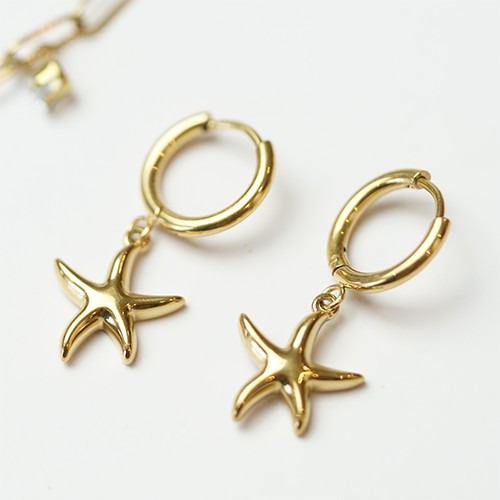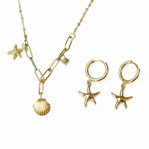 Inspired by coastal style, this starfish set adds a trendy touch to your accessories. Made from water-resistant, tarnish-resistant 24K PVD Gold Surgical Steel.