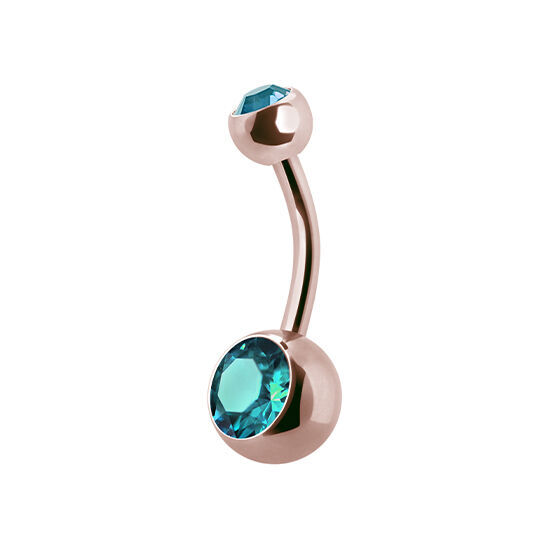 This belly bar is made from Rose Gold PVD coated SS316L Surgical Steel. Available in a variety of gem colours, it features a 5mm crystal gemstone top ball and an 8mm crystal gemstone bottom.