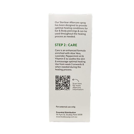 The Sterilear Piercing Spray Step 2 formula creates an optimal environment to care for your piercings during the healing process. Use Sterilear Step 2 in weeks 3-4 after your piercing, following the use of Step 1. Sterilear Step 2 supports the healing process of all piercings with the effects of natural sea salt and minerals.