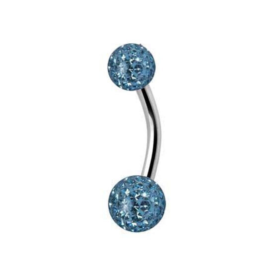 Sparkle from every angle with this belly bar with epoxy crystal balls on both ends is made of SS316L Surgical Steel. The crystal gem stones shine and sparkle and have beautiful colours that catch the light. This belly ring is 14 Gauge 8 or 10mm in length.
