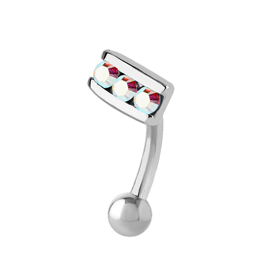 This is a micro banana bar made of SS316L surgical steel with a band of gems set in one end is designed for an Eyebrow but equally impressive in any Helix, Tragus, Ear or Rook. 16 Gauge 8mm in length, try this out for an impressive alternative. Available in 3 colours.