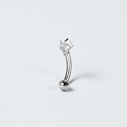 This beautiful curved banana barbell is made from high-polished, scratch resistant SS316L Surgical Steel. Featuring a square cubic zirconia gemstone top and a plain ball base. The highest quality materials have been used to craft this beautiful piece and guarantee high skin tolerability and longevity.